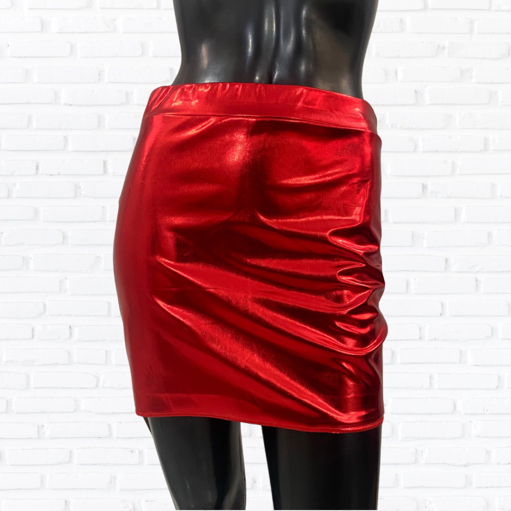 Saia lápis com cós largo, zíper lateral, metalizado e forrado.