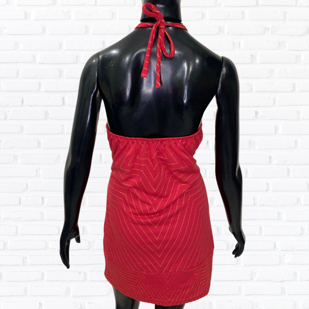 Vestido frente única com alça, todo em malha de algodão forrado. Elástico ajustável nas costas.